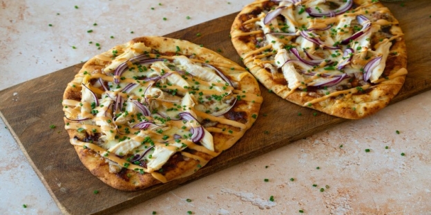 Top store-bought naan or flatbread with barbecue sauce, shredded rotisserie chicken, cheese, and red onion. Bake for 10 minutes until bubbly. Add cilantro at the end.